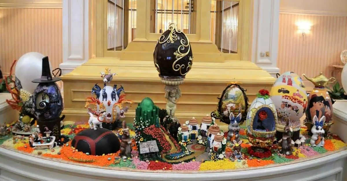 You will find the interior lobby filled with beautifully hand-decorated chocolate Easter Eggs.